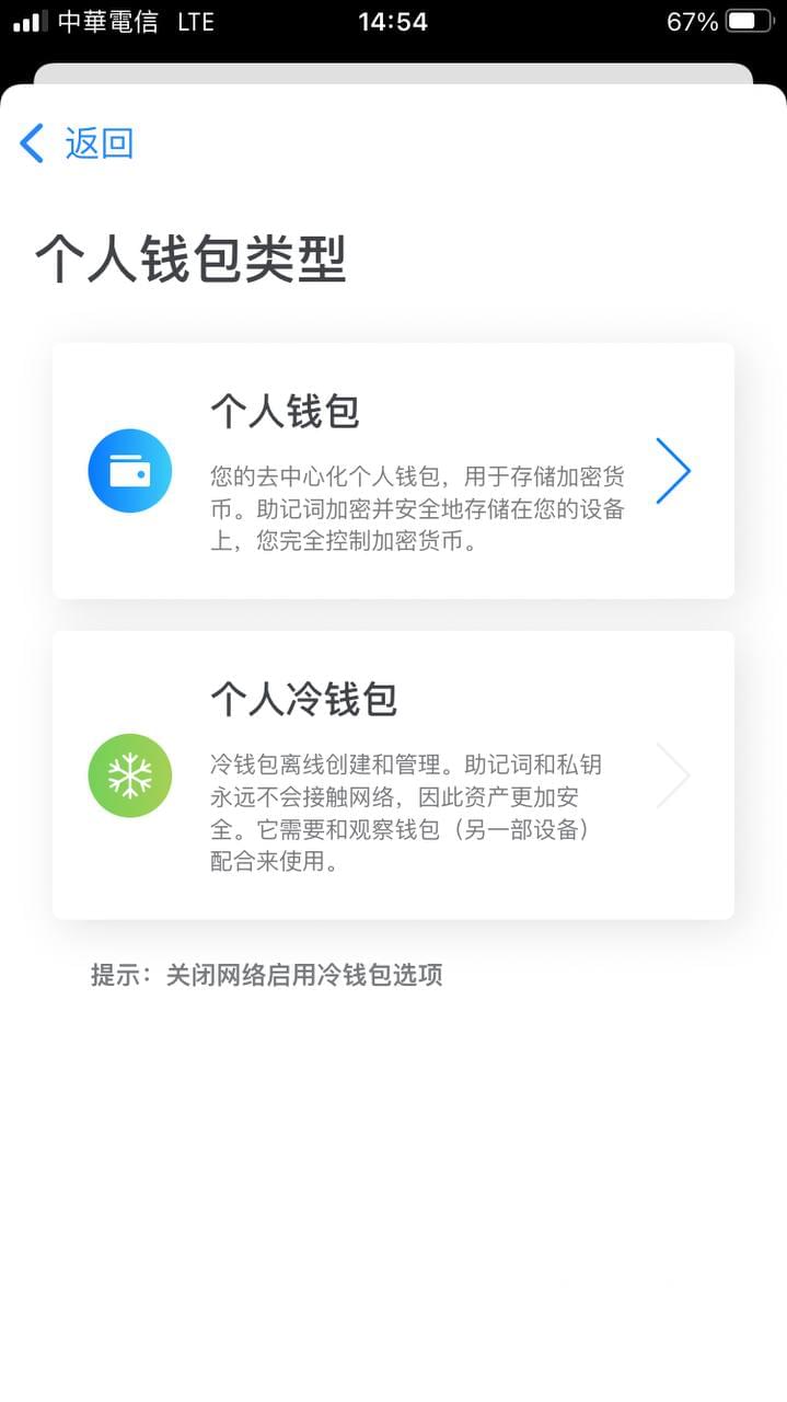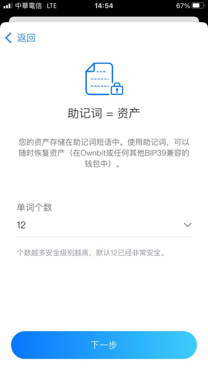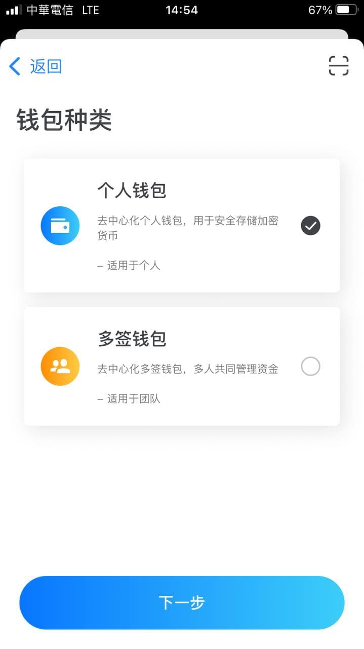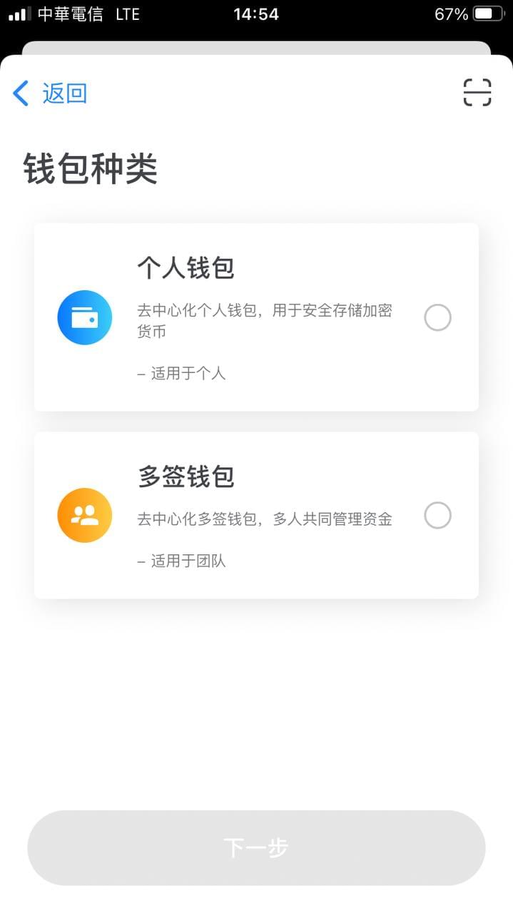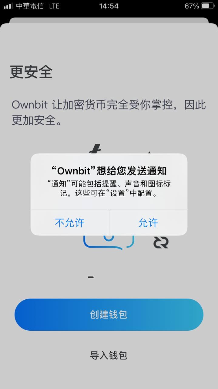 1.请至APP STORE,下载ownbit,点击创建钱包,点击个人钱包,进行下一步。 (IOS)