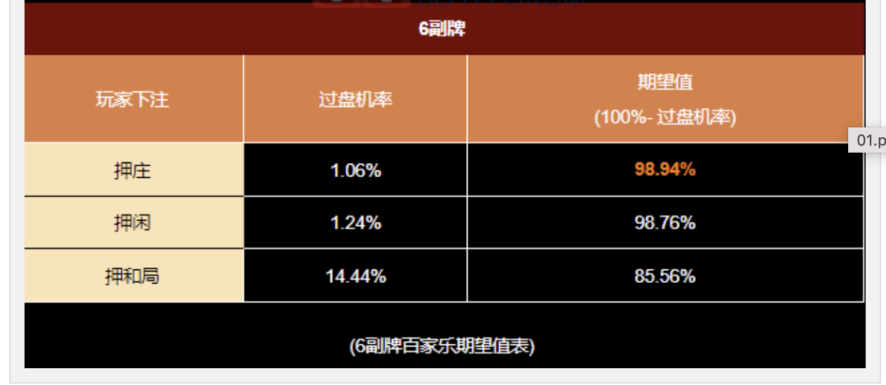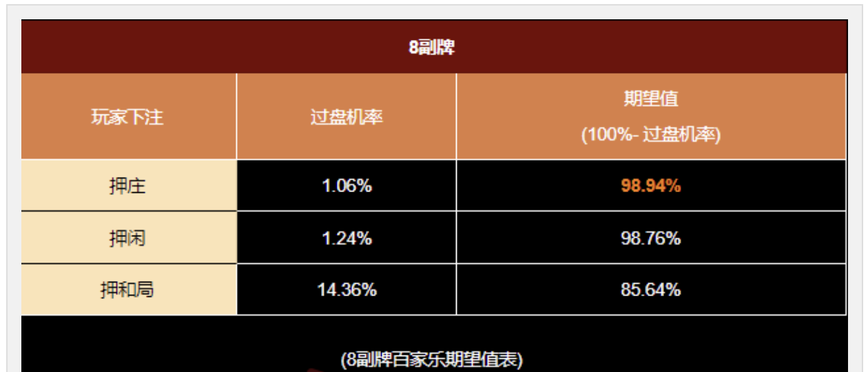 所谓百家乐期望值就是「玩家预想自己在每一局游戏中能获利多少金额」,也可以称为「或然率」、「期盼值」。因为百家乐的过盘机率平均只有1.06%,所以百家乐是所有游戏期望值最高的。